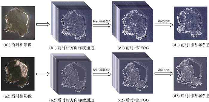 在形成方向梯度通道之后,在X和Y方向上采用二维高斯核、梯度方向上采用[1, 2, 1]T核进行特征通道卷积和归一化处理形成CFOG,最后将CFOG所有通道对应位置求和取平均构建单通道结构特征,以减少特征维数。图 3显示了双时相影像结构特征的构建过程,从中可以清晰地看出,由于CFOG不受大气折光和灰度差异的影响,因此基于CFOG的结构特征能够较好地反映地物的几何结构信息。