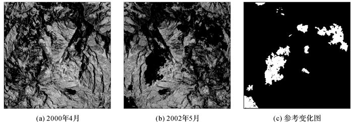 2 试验与分析 2.1 试验数据本文通过选取两组不同传感器的数据集,检验算法的有效性,其中每组试验区域均包含两幅已配准的不同时相的遥感影像和一幅参考变化图,在参考变化图中白色部分表示变化区域,黑色部分表示未变化区域。