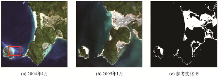 第2组数据集为印度尼西亚数据集(图 5),该数据集是由Quick Bird卫星于2004年4月和2005年1月拍摄,影像大小为1500×1500像素,分辨率为2.5m。该数据集反映的是印度尼西亚地区受海啸侵袭影响的地表变化情况,此时间段正直海啸过后,植被、水体等土地覆盖类型发生显著变化,且两幅影像之间存在大气折光差异(前时相影像中存在大气折光,如图 5(a)中矩形框所示。参考变化图通过目视解译获得。