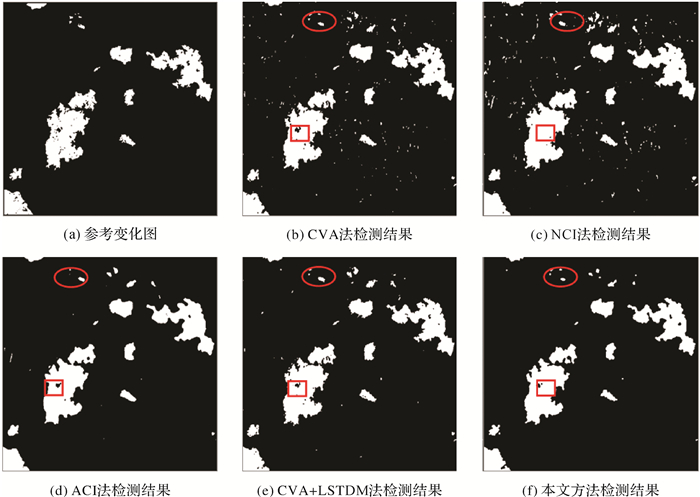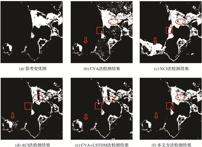 图 6(e)、图 7(e)检测结果表明,CVA和LSTDM相结合的方法受大气折光、水质差异影响较小、椒盐现象较弱,但该方法对变化信息的灵敏性较弱,无法正确识别光谱差异较弱的变化区域(如图 6(e)和图 7(e)中灰色椭圆框所示),漏检率较高。