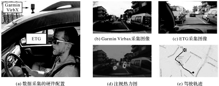 1 数据预处理 1.1 数据本文所使用的数据为意大利摩德纳大学发布的DR(eye) VE驾驶场景数据集[18]。该数据集记录了8名驾驶员(7男1女)74次驾驶过程,每个驾驶过程持续5 min。这组数据包含了驾驶员的注视点、行车录像、GPS轨迹和驾驶速度等信息。驾驶员位置每秒更新一次,驾驶速度每秒记录25次。数据收集的硬件配置和数据格式如图 1所示。车顶摄像头Garmin配置为1080p/25 fps,用于固定观察视角,车辆配有GPS。驾驶员驾驶过程中佩戴眼镜式眼动仪ETG,该眼动仪注视点采集频率为60 Hz,眼动仪的摄像头配置为720p/30 fps, 可同步记录驾驶员视角下的场景。