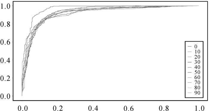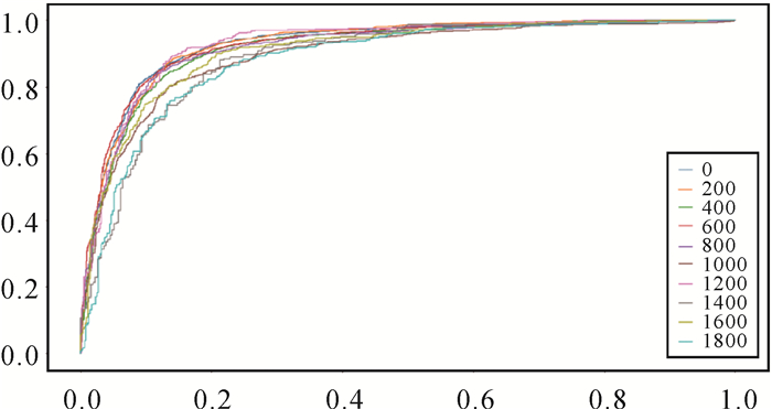 不同曲率下的ROC曲线如图 9所示,其预测精度在不同曲率下相差很大,当曲率大于1000时,ROC曲线比曲率小于1000的ROC曲线低。各种曲率下的AUC见表 4。