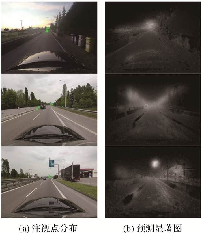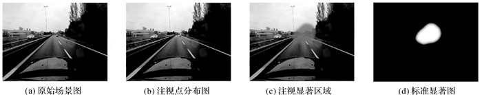 3 结果 3.1 模型结果验证数据集占全部数据集的30%,即6660个场景。本文提取验证数据集的3类特征,并逐像素地输入训练好的LR模型,将输出的像素值组合成预测显著图。LR模型计算得到的显著图是一张连续的灰度图像,灰度的大小表示像素的显著程度。部分视觉显著图计算结果如图 7所示。灰度值高的区域能够与注视点生成的标准显著图显著区域对应。在不同的驾驶情况下,LR模型对道路消失点、车辆和指示牌等目标的显著性都能准确预测,模型的AUC值达到90.43%。