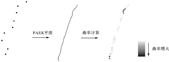 道路曲率由原始的GPS点位数据计算得到(图 3)。GPS定位的偏差使得轨迹无法直接用于计算道路曲率,因此本文采用了指数多项式平滑算法(PAEK)来平滑原始轨迹点然后将平滑后的线条重新采样成点,最后用三次B样条法[37]计算曲率,计算方法为