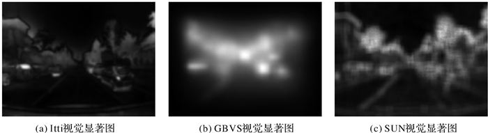 对特征系数进行分析,亮度特征对驾驶环境下的场景视觉显著性为负,主要原因可能是整个场景中天空的亮度值最大,然而驾驶员在驾驶过程中并不关注天空。红色通道系数大于绿色和蓝色通道的系数,一个主要的原因在于颜色通道特征和语义特征的关联性。在所有场景中植被区域的绿色通道比重大,天空区域的蓝色通道比重大。而这2类语义信息并不显著,从而导致了RGB 3通道系数的差异。GBVS模型显著图的显著区域集中于图像的中心区域如图 8所示,与道路消失点特征有一定的关联,所以GBVS模型显著图对场景的视觉显著性的贡献较大。Itti模型显著图和SUN显著图对最终显著图的贡献不大,这可能是因为这2个模型侧重于检测边缘信息,然而这类信息在驾驶过程中对视觉引导作用很弱。
