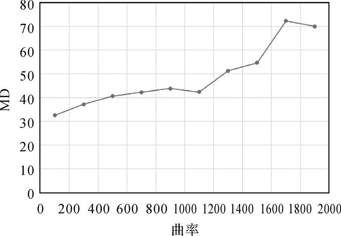 为讨论曲率对注视点位置的定量影响,本文计算得到每个曲率范围下的注视点离散度的均值(附图 2)。当曲率为100时的离散度仅为32 px, 而在0~1600区间内,随着曲率的增大,注视点离散度也随之缓慢增大,当曲率达到1500时,注视点的离散度达到55 px。而当离散程度在1600以上时,注视点离散程度急剧增大,并保持在70像素左右。