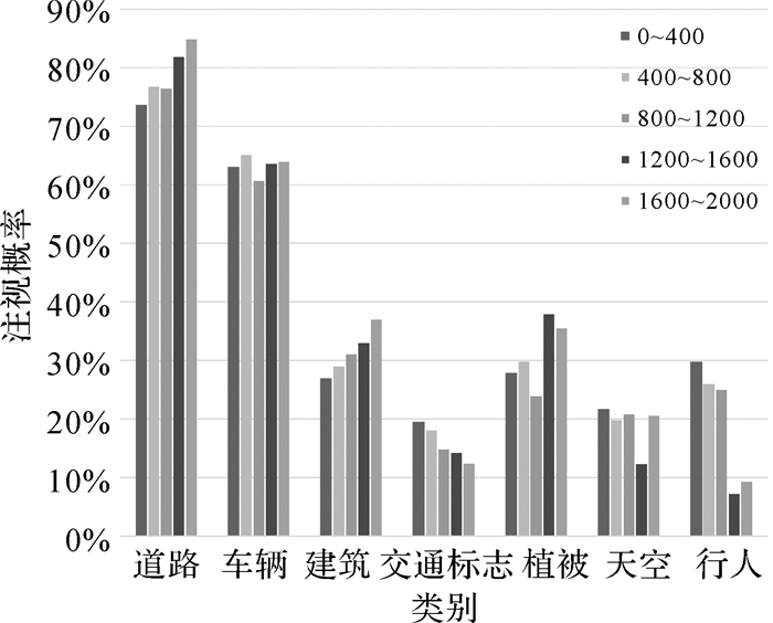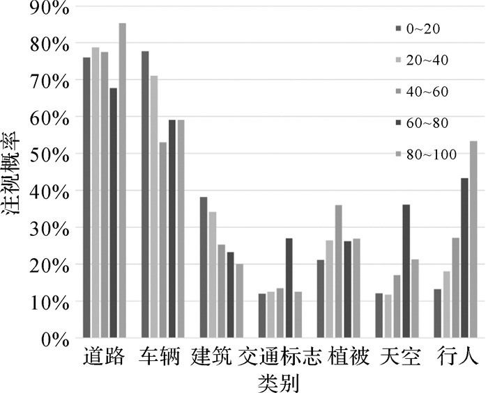 不同速度注视概率统计结果如附图 6所示。道路的注视概率最大,车辆的注视概率次之;随着速度的增大,车辆和建筑的注视概率减小,车辆的注视概率由低速下的78%减小到高速下的59%,建筑的注视概率由低速度下的38%减少到高速下的20%;随着速度增大,高速下行人的注视概率提高到低速下注视概率的4倍,由低速下的13%提高到高速时的53%;道路、交通标志、植被和天空的注视概率无明显变化规律。