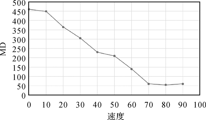 定量计算各速度下的注视点离散度, 如附图 5所示,当速度达到70 km/h之前,注视点离散程度逐渐减小,离散程度和速度呈现线性递减。而当速度达到70 km/h之后,随着速度的增加,注视点离散度保持在50 px左右且不再改变。