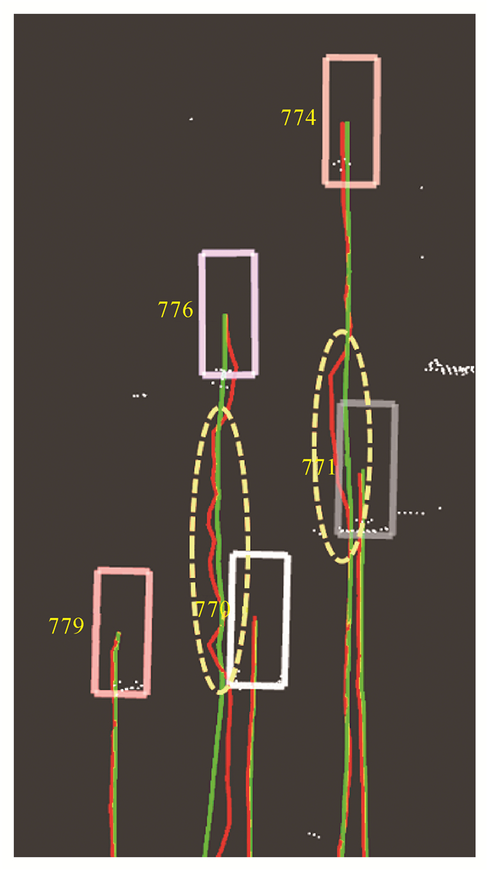 3.3 定性试验与分析为了对增强前后车辆跟踪轨迹进行直观分析,对其进行了可视化。图 10显示了目标直行场景下的对比结果。其中红色曲线为道路朝向先验增强前的目标跟踪轨迹,绿色曲线为增强后的目标跟踪轨迹。以776号目标为例,增强前目标跟踪轨迹抖动较为严重,而增强后的目标跟踪轨迹较为平滑。同时774号目标原本的跟踪轨迹在中间位置存在突变,但是基于本文方法进行增强后,目标跟踪轨迹更加平滑。