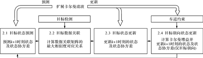 车辆的跟踪方法基于卡尔曼滤波框架[15],包含目标状态的预测与更新两部分,但由于空间中存在多个目标车辆,每次进行目标状态更新时需要将预测结果与当前帧的检测结果进行对应,因此在预测与更新过程中引入数据关联模块进行目标的对应。在完成基于检测结果的目标状态更新后,会将目标的朝向状态依据车道约束再次进行更新,完成当前帧的车辆跟踪。整个跟踪任务的流程如图 7所示,分为4个主要部分,其中数字编号对应的是本节中的小节编号。