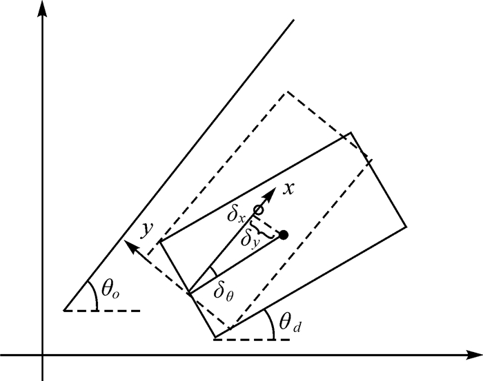 2.4 目标朝向状态更新本文假设道路上行驶的车辆基本都是沿着车道线行驶,车辆的真实朝向与车道线的朝向相同。如图 8所示,θo为车道线朝向,θd是目标检测的朝向,朝向误差δθ=θo-θd。以目标底边的中心点为坐标原点,车道线朝向为x轴,车道线垂直方向为y轴,建立目标坐标系,则虚拟目标真实框(图中虚线框)与目标检测框(图中实线框)位置上的误差为