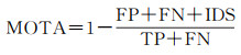 式中,TP(true positive)表示检测为正样本并且真值也是正样本的个数;FN(false negative)表示检测为负样本但是真值是正样本的个数;FP(false positive)表示检测为正样本但是真值是负样本的个数;IDS(ID switch)表示目标ID切换的次数,对于一个良好的目标跟踪系统,需要对目标进行持续跟踪,同一目标在不同帧之间的ID应该保持一致,因此IDS越多指标越低。