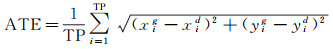 另一个评价指标采用平均位移误差(average translation error,ATE)[35],主要用于车辆跟踪轨迹误差的评估,其定义为