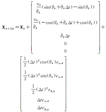 假设离散的时间步k和连续时间值tk相关,离散的时间步k+1与连续时间值tk+1相关,tk和tk+1之间的时间差为Δt,则状态转移方程为