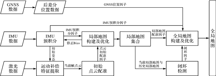 与松耦合方法相比,紧耦合方法直接融合了激光原始特征信息和惯性单元测量值等输出运动状态量,具有稳健性强且制图精度高的优点[8]。近年来,多种紧耦合方法被相继提出。例如文献[13]将IMU预积分值应用到点云的运动畸变补偿中,实现了LiDAR和IMU的外参校正;文献[14]基于视觉惯性紧耦合SLAM方法引入了一种紧耦合的激光惯导SLAM框架,联合优化激光雷达特征点和IMU的观测量,与LOAM相比获得了更准确的结果,但是其效率较低,惯导初始化条件复杂,场景特征缺乏区域稳健性较差。文献[15]提出了一种以机器人为中心的激光雷达惯性状态估计器R-LINS,该方法利用迭代误差状态卡尔曼滤波器修正了机器人的状态估计,但存在长期运行会产生漂移的问题。文献[16]提出一种面向移动机器人的激光惯导紧耦合实时定位方法,该方法具有较好的实时性,但在开阔的室外环境下定位精度达分米级。文献[17]构建了基于因子图的紧耦合激光惯导里程计框架(LIO-SAM),将不同来源的IMU预积分因子、激光里程计因子、GNSS因子和闭环环因子进行联合优化,取得了较高的测图精度,但该方法只是简单地将GNSS因子加入联合优化中,未考虑复杂环境下GNSS异常对SLAM结果的影响。总体而言,目前已有方法主要针对小范围的室外街道或室内建筑场景,应用的地理覆盖范围有限,在场景复杂、GNSS信号不稳定、制图范围广且精度要求高的城市测绘应用中仍存在着累积误差大、稳健性差的问题[18-19]。
