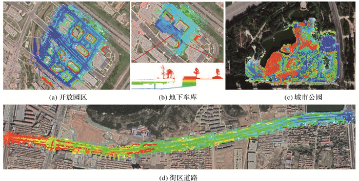 为验证本文方法的有效性,采用了集成Velodyne VLP-16 LiDAR、Xsens MTI-100 IMU和Novatel 718D GNSS系统的背包式激光扫描平台对4种典型城市场景(开放园区、地下车库、城市公园、街区道路)进行了数据获取(图 3)。