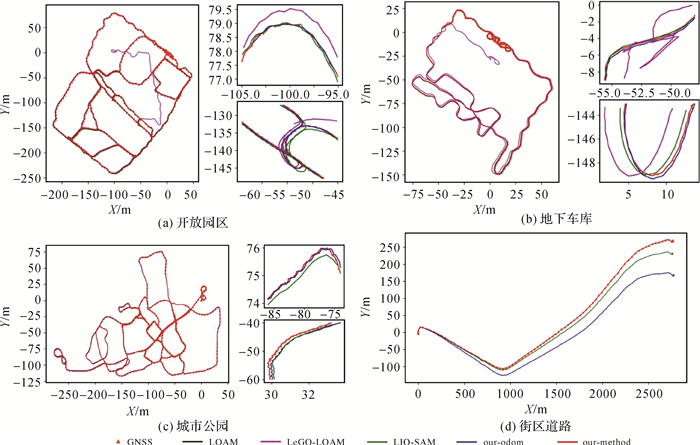 试验区中,开放公园整体为大型回环,场景中包含大量的建筑立面和少量移动车辆,轨迹总长度约为2.7 km,数据采集过程中存在少量往返采集。地下车库场景面积较小,轨迹总长度约为800 m,数据采集过程中场景内无移动目标干扰,但该场景GNSS信号较弱,存在GNSS信号丢失现象。城市公园场景内地物以树木为主,由于树木枝叶对激光扫描的遮挡,该场景内存在大量往返扫描。街区道路场景为笔直的城市主干道,扫描过程中存在大量移动车辆和行人的干扰,行走轨迹不存在闭环。各场景复杂情况和数据采集信息见表 1。