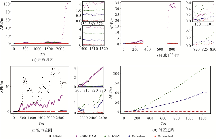 各场景下4种SLAM方法的轨迹APE随时间的变化情况如图 5所示。在开放园区场景地下车库场景中,LeGO-LOAM方法出现点云配准失败情况后,误差直线上升(图 5(a)和5(b))。城市公园场景中, LeGO-LOAM、LIO-SAM和本文方法的轨迹APE均随时间变化存在起伏(图 5(c)),说明3种方法的闭环约束均削弱了累积误差的影响,且本文方法的累积误差最小。街区道路场景中,LIO-SAM存在较为严重的退化现象,APE随时间的增加显著上升。