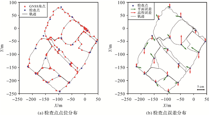 本文以开放园区为例,进一步展开本文方法点云制图结果的精度验证工作。试验采集了均匀分布于开放园区场景测区的20个有效的检查点(图 6(a)),用于点云制图结果的绝对坐标精度验证。验证结果表明,本文所提方法制图结果的平面中误差为0.041 m,高程中误差为0.024 m,整体中误差为0.047 m(表 4),检查点的平面和高程误差分布均为残留的随机误差(图 6(b)),误差分布相对较大的点基本位于移动轨迹出现急剧方位变化之处,原因在于该处相对于平滑运动的轨迹而言仍有部分姿态误差残留,本文方法可有效提升SLAM制图的绝对坐标精度,满足复杂城市场景下的高精度制图要求。
