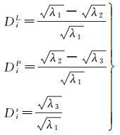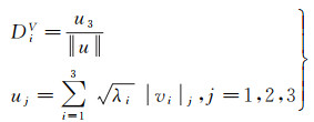 (5) 在非地面点中,对于每个点通过邻域搜索的方式计算其3个特征值(λ1, λ2, λ3)和对应的特征向量(v1, v2, v3),从而计算4种点云几何特征(线形DiL、面形DiP、球形Dis,垂直度DiV),根据经验阈值将DiL≫DiP&&DiS,DiV>0.9的点视为杆状特征点fl,DiP≫DiL&&DiS,DiV>0.8的点视为面状特征点fp,并同时计算杆状点的主方向nfl和面状点的法向量nfp[23-24]