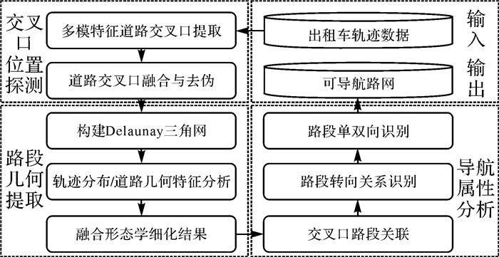 在文献[2, 14, 20]中,基于交叉口连接特征及出租车轨迹密度特征,设计了一种交叉口优先的城市路网生成方法。首先通过结合数学形态学处理与密度峰值聚类(CFDP)[25-26],开展矢栅融合的交叉口识别;然后据此对形态学方法生成骨架线进行位置调整及断裂修复,在一定程度上解决了从低质量出租车轨迹提取交叉口及其关联路段的问题。由于城市路网的复杂性,仍然有大量未识别和错提取的现象。为此,本文一方面致力于交叉口及其路段的全面精确识别;另一方面着眼于转向等导航信息的提取,从而构建出面向城市的可导航路网结构。具体而言,考虑到交叉口的连接本质,采用“交叉口位置-路段几何-导航属性”的研究思路(图 1)。首先,在已有工作基础上设计顾及多模特征的交叉口集成识别方法及零样本监督式去伪策略;然后,考虑Delaunay三角网邻接特征,轨迹分布特征及道路几何特征,识别交叉口之间的拓扑关系,并融合形态学结果生成路段几何;最后,分析出租车轨迹在交叉口处的方向与连接信息,推导交叉口转向规则及路段单双向属性,从而实现城市可导航路网的构建。