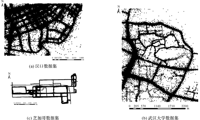 4 试验分析 4.1 研究区域与数据集本文试验数据包括汉口出租车轨迹数据、武汉大学出租车轨迹数据及芝加哥校园巴士轨迹数据(图 10)。文献[28]认为当采集周期超过7 d后,武汉市路段上出租车数据覆盖宽度逐渐趋于稳定,因此,武汉两个研究区域选取2014-05-29-06-04的1周内出租车轨迹数据进行试验。汉口区为武汉市中心城区,新旧建筑交错,道路间距不一;武汉大学研究区道路曲折多样,无一定几何形状,都对低频轨迹应用于道路信息提取的分析与挖掘有一定代表性。由于武汉大学数据集噪声较大,连续点间的时间间隔及空间间隔不一致,本文对武汉大学数据进行了如下预处理:①删除原始轨迹数中位置重复记录、航向为0、速度为0及速度超过100 km/h的轨迹点;②当相邻轨迹点时间间隔大于60 s、两轨迹点之间距离大于100(km/h)×60 s≈1.3 km或两轨迹点之间距离大于(v1+v2)×(t2-t1)/2时,对轨迹进行打断,删除轨迹点个数小于1的轨迹。芝加哥数据集为公共数据集,其采样频率(2~3 s)及定位精度较高,为验证本文方法处理低频轨迹效果,将其进行了30 s抽稀。表 2为预处理后轨迹数据情况。