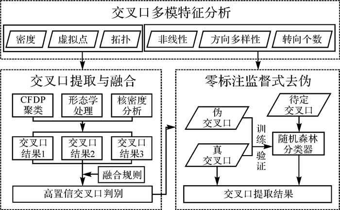 作为路网结构提取及导航属性分析的首要环节,交叉口识别的全面性与准确度直接影响可导航路网的生成质量。为此,本文分析与挖掘出租车轨迹在矢栅空间关于交叉口的多模特征,设计道路交叉口的集成识别技术,提出基于随机森林方法的零标注监督式分类,实现待定交叉口的去伪留真。具体技术流程如图 2所示。