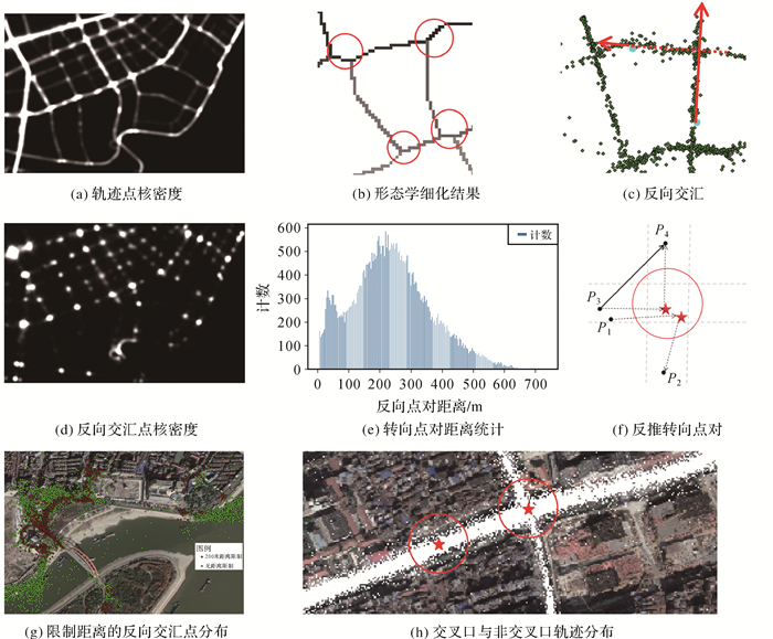 由于路段的通行特性,一般不会像交叉口处一样发生大量转向,因此以某点为中心,搜索h范围内反向交汇点(图 3(f)中的红色五角星),进而反推转向点对TP(如(P1, P2)(P3, P4)),基于转向点对起始与终止方向进行层次聚类,并统计转向点方向聚类个数,即可有效区分交叉口与其他区域。