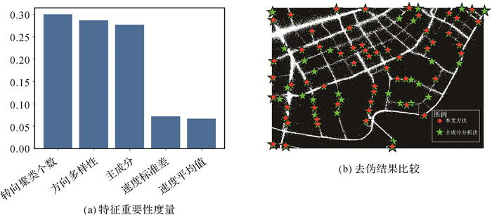 考虑到基于融合规则判别的真伪交叉口(图 4(a))分布均匀且代表性强,本文随机将真伪交叉口60%作为训练样本,40%作为验证样本。首先利用训练样本,基于随机森林分类器对上述特征进行重要性度量,如图 5(a)所示,优先选择重要性分值最高的3个特征fΔ、fH和fC;然后对fΔ、fH和fC随机组合进行训练,得到各组合训练的模型;利用验证样本,基于各组合训练的模型,得到各特征子集识别准确率,最终选择识别率最高组合(fΔ、fH、fC)训练的模型对待定交叉口进行零样本监督式去伪。与仅考虑交叉口非线性特征的主成分分析去伪方法相比,该方法既较大程度保留了真交叉口(图 5(b)),又剔除了大量伪交叉口,有效解决了监督分类需要标注及单特征识别精度不高等问题。为保证分类模型计算速度及精度,所有特征均进行了min-max标准化处理。
