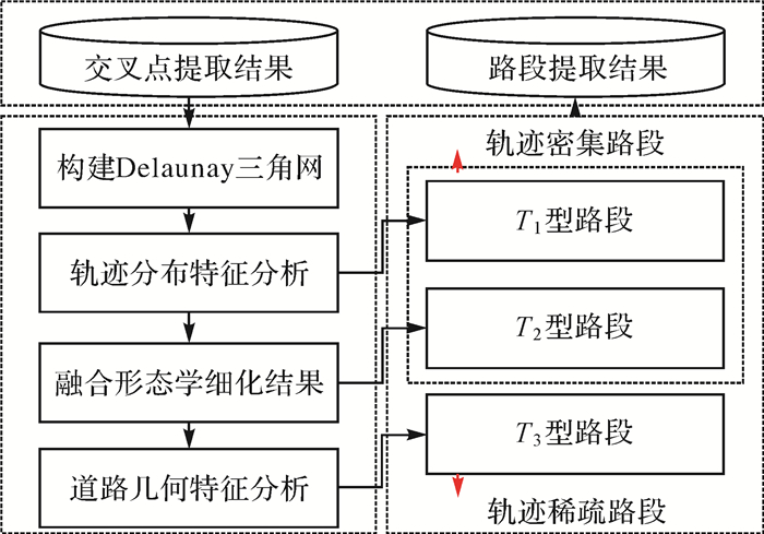 任意两交叉口之间可能有路段连接,但相距较近的交叉口之间存在路段的可能性更大。考虑Delaunay三角网边在一定程度上反映交叉口之间的邻接信息,本文综合轨迹点分布特征及道路几何特征,融合形态学细化结果,提出一种基于Delaunay三角网的多阶段路段生成方法,不仅有效避免了扫描所有组合而引发的计算风暴实现大规模路段的高效探测,还解决了间隔较小交叉口附近路段的扭曲问题,识别了密集区域及稀疏区域路段信息,具体流程如图 6所示。