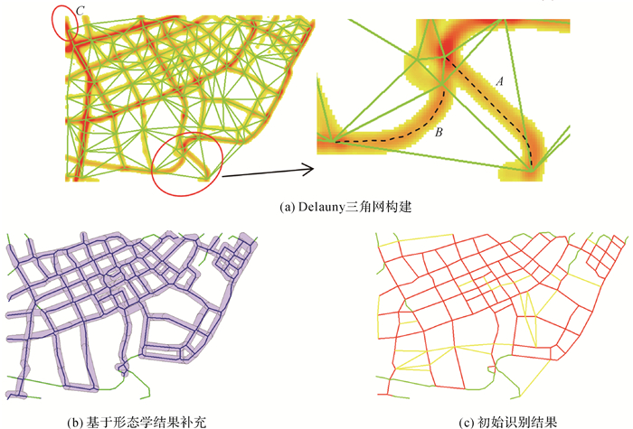 (2) 考虑到Delaunay三角网的最大空圆准则及上述策略无法识别弯曲路段和研究区边缘路段,如图 7(a)中A、B、C区域,本文将形态学骨架线矢量化并化简,与路段集T1 50 m缓冲区进行匹配,保留长度大于l的未匹配路段,如图 7(b)所示,并基于方向与距离将其延伸到相应交叉点及缺失路段端点。完成以上3种状况路段的补充,记为T2,如图 7(c)中的绿色路段。