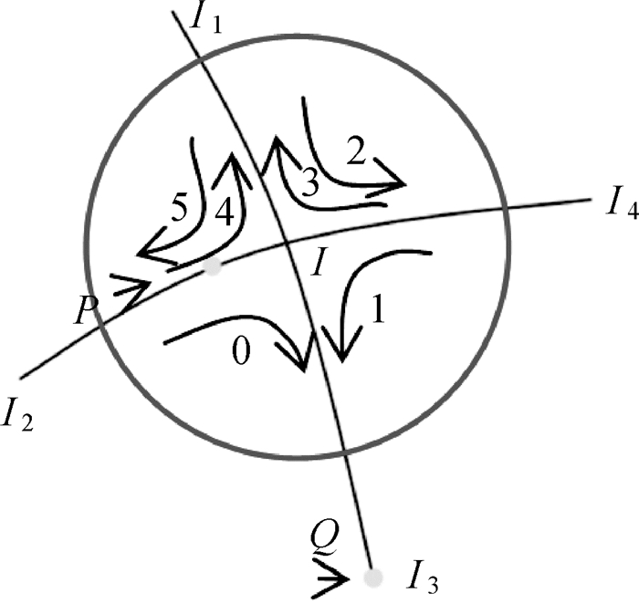 3.2 路段单双向判断路网中路段的单双向信息也是导航属性的重要组成部分,可由交叉口识别的关联路段间转弯信息进一步推导获得。以图 9交叉口I为例,I2-I路段右转向I-I3路段,即存在轨迹由路段I2-I途径交叉口I至I-I3。进一步而言,如果存在路段途经交叉口I至I-I2,则路段I2-I为双向通行路段,否则为单向通行路段。