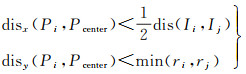(1) 范围限制。以Ii与Ij之间的中点Pcenter为原点,Ii Ij为X轴,Ii Ij的垂线为Y轴,如图 8(b)所示。则子轨迹点到原点的距离在X轴方向投影disx(Pi, Pcenter)及在Y轴方向投影disy(Pi, Pcenter)满足以下条件