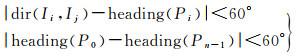 式中,Pi、Pj为子轨迹点(0≤i < j≤n-1);dir(Ii, Ij)为Ii Ij路段方位角;heading(Pi)为子轨迹点Pi头方向。