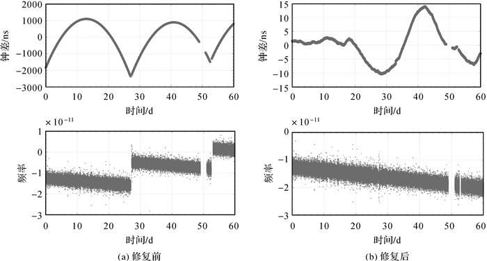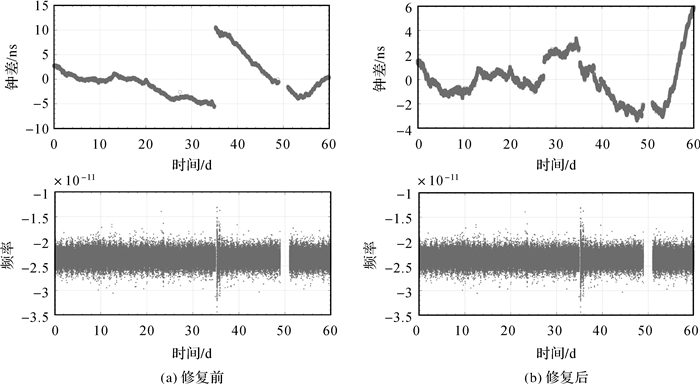 由图 1可以看出,C32卫星在60 d时间里,有两次明显的跳频,频率时间序列呈3级台阶状,在对应时间,钟差的变化趋势也发生了明显的改变。通过检测频率跳变发生时间,对跳变前后的频率趋势进行拟合,可以计算频率跳变量,修复频率跳变,获得连续平滑的频率时间序列。