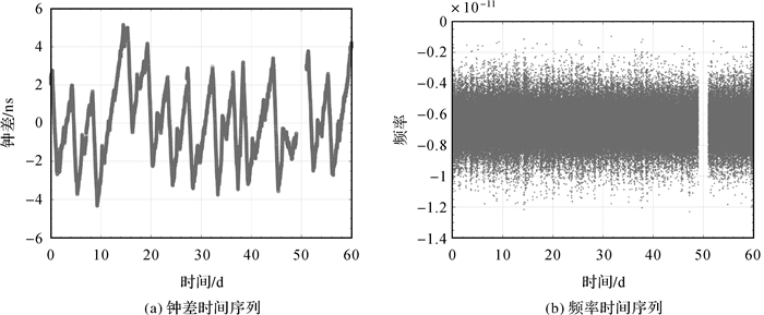| 图 3 C60卫星钟差及频率时间序列(钟差时间序列趋势项已去除) Fig. 3 Clock error and frequency time series of C60(with the clock error trend removed) |