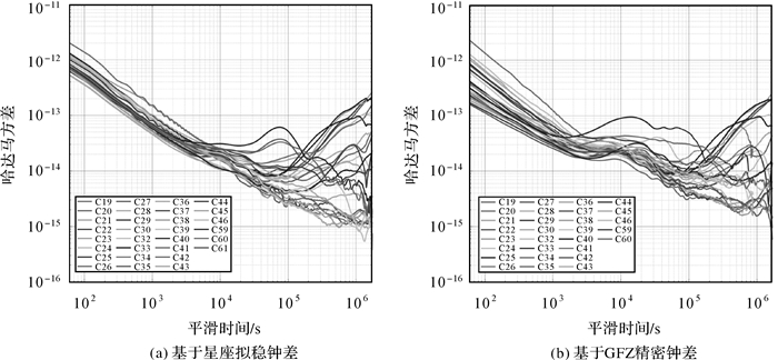 利用星座拟稳钟差分析IGSO卫星氢原子钟1000 s、10 000 s和1 d采样间隔的哈达马方差结果分别为5.9E-14、1.1E-14和2.8E-15,而基于精密钟差的分析结果分别为3.2E-14、2.9E-14和9.8E-15。说明IGSO卫星的氢原子钟具有很高的短期稳定性和长期稳定性。