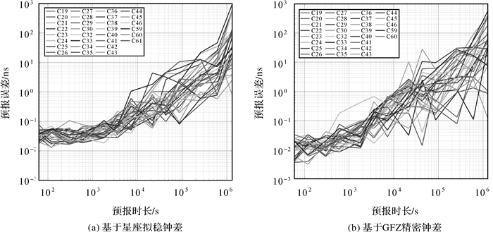 3.3 钟差预报精度分析分别利用星座拟稳钟差和GFZ精密钟差评估北斗三号卫星钟差的预报精度,钟差预报精度变化趋势如图 5所示,统计结果见表 4,其中长期预报精度统计方法为统计最后1 h预报误差的均方根误差作为预报误差。