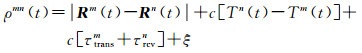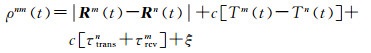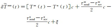 式中,t是归算后的中间时刻;ρmn(t)和ρnm(t)为归算后的卫星m和卫星n之间的正反向测距值;Rm(t)和Rn(t)分别为卫星位置向量;Tm(t)和Tn(t)为相对于BDT的钟差;τsendm、τrcvm、τsendn和τrcvn分别为两颗卫星的星间链路设备收发时延;ξ为未模型化的系统误差及观测噪声;c为光速。