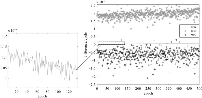 下面用实测静态数据进行验证:首先用精密星历计算得到的卫星位置、速度,用精密单点定位确定接收机位置,并进行多普勒重构。然后用广播星历计算得到卫星的位置、速度,用伪距单点定位计算接收机位置,并进行多普勒重构。最后以精密星历重构的多普勒为基准,以广播星历重构的多普勒结果减去前者。对于广播星历得到的卫星位置,伪距定位得到的接收机位置,都是米级误差,这些误差综合起来可达十几米。但是从图 3重构多普勒对比的结果看,GEO卫星差别最小,是10-4数量级,IGSO和MEO是10-3数量级,这些误差对重构的影响很小。这可以用式(1)中的重构原理进行解释:结合式(1)和表 1,上述米级误差,经过除以107 m数量级的站星距|ρ|,再乘以103 m数量级的卫星速度,这些误差的影响将会降至原来的10-4倍。虽然GEO的轨道精度最差,但是由于它的轨道高度较高,|ρ|较大,且是同步卫星,速度相对于其他卫星很小,从而使得在重构多普勒过程中反而受轨道误差的影响最小。因此用广播星历和伪距单点定位算法得到的卫星位置、速度、接收机位置也能较好地重构多普勒。而经过双频组合后的波长变得很长,重构其多普勒的误差会更小。