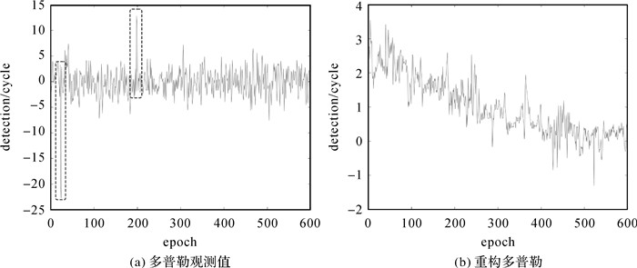 这里再对比北斗B1频点的多普勒观测值和重构值的周跳探测噪声:图 4是采用多普勒积分法对一组无周跳的数据(30 s历元间隔)进行周跳检测的结果,横坐标表示观测历元,纵坐标表示周跳探测的结果。理论上无周跳时,探测结果应该小于1,但明显多普勒观测值的探测误差比较大,特别是在图 4(a)中框出的历元处。对比可知,用重构多普勒进行积分探测周跳的效果要优于用多普勒观测值。