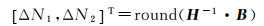结合式(8)和式(12),可以看出上述两种方法都存在探测盲点,对式(8),当ΔN1=ΔN2时探测不出;对式(12),ΔN1≈f1/f2×ΔN2时不敏感,比如(ΔN1, ΔN2)为(9, 7)的周跳。那么就需要联立方程组解算出周跳。设重构多普勒积分法的周跳探测量为a,STPIR法的周跳探测量为b。由于ΔN1和ΔN2都是整数,则ΔN1-ΔN2必然是整数,因此先对a进行四舍五入取整(round),然后联立STPIR法,可得如下方程组
