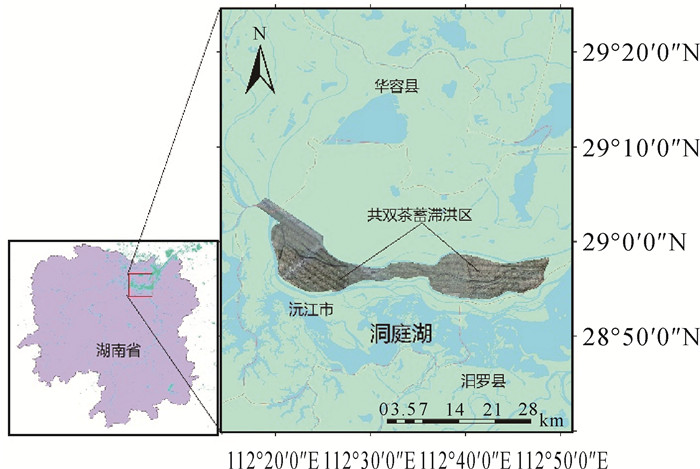 | 图 1 共双茶垸蓄滞洪区在洞庭湖区的位置 Fig. 1 The location of the Gongshuangcha detention basin in the Dongting Lake area |