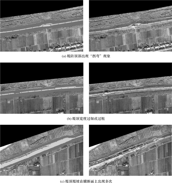 尽管堤防在正常区域能够提取出正确的堤顶、堤坡形态参数。但是,因为受到水土侵蚀、人类活动等影响,仍然存在部分堤防堤顶和堤坡形态被破坏的情形,如图 14所示。在图 14(a)中,因为在堤顶存在建筑物,堤防堤顶多边形出现“拐弯”现象,且建筑物区域的坡度也处于堤顶坡度范围,同时导致堤防中心线也出现“拐弯”现象;在图 14(b)中,因为人类活动和水土侵蚀,堤顶宽度出现剧烈变化,堤顶过宽或过细,这是堤防缺乏养护的典型表现;而在图 14(c)中,由于人类活动对堤防破坏太大,不仅出现堤顶宽度过宽,而且导致堤防中心线变道,堤防在纵向上,出现多条堤顶和堤坡区域。