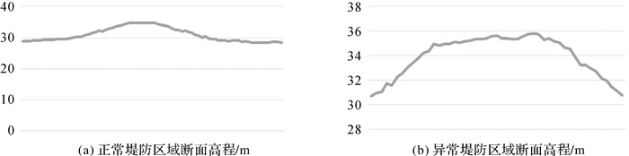 堤防破损对断面高程的影响也不容忽视,在堤防破损比较严重的区域堤顶宽度和堤坡坡度都发生了显著的变化。如图 16所示,图(a)为正常堤防区域某断面的高程变化,图(b)为异常堤防区域某断面的高程变化。本文研究区堤防堤顶高程在35 m左右,在正常堤防区域堤顶部分高程值与堤坡高程值有很明显的对比,堤顶宽度也符合堤防设计规范,而在异常堤防区域,由于堤防受到较严重的破坏,导致堤防堤顶区域不明显,整个横断面有一大片区域高程值都达到35 m,导致堤坡窄而陡。