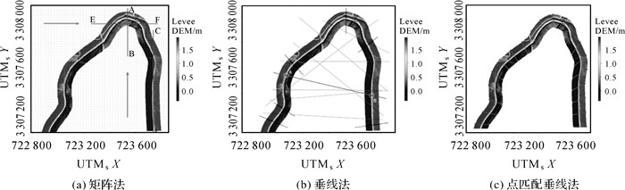 图 17是文献[21]提出的堤防中心线生成方法,其中矩阵法是自动算法,垂线法和点匹配垂线法是半自动算法。图 17(a)为矩阵法示意图,扫描线EF实际跨越了两个堤防中心线点,但是算法只能提取其中一点,因此对于堤防弯曲较大的区域存在漏掉关键点的可能。同时,当局部堤防区域过于水平或垂直,扫描线很难提取到所有中心线点。如图中扫描线CD几乎与堤防中心线重合,再加上此区域横向扫描存在跨越两次堤防中心线的情形,使得中心线点提取存在困难。