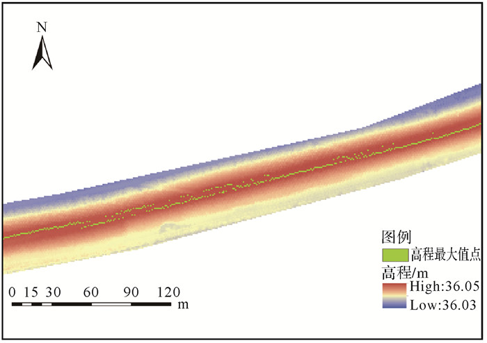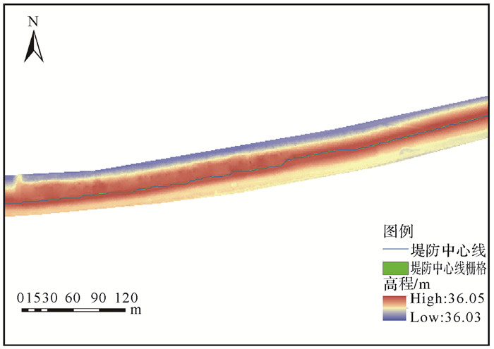 本文提出的圆环探测法有效规避了各种堤防异常问题,如图 13所示,堤防由于破损等情形的存在导致DTM中网格高程异常。其中的暗色斑点属于异常高程点,这对如矩阵法、最小成本路径法等逐栅格提取中心线的方法易使得计算结果效果较差。本文方法在堤防上间隔采样,可以在一定程度上避开这些局部高程异常的网格,尽量保证堤防中心线处于堤防纵向中心位置。在一些堤防破损非常严重的区域,有少数这种高程异常凸起的网格点被采样作为堤防中心线点,这些偏离堤防中心区域的异常点也表明了此处堤防破坏较为严重。