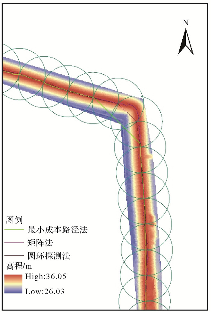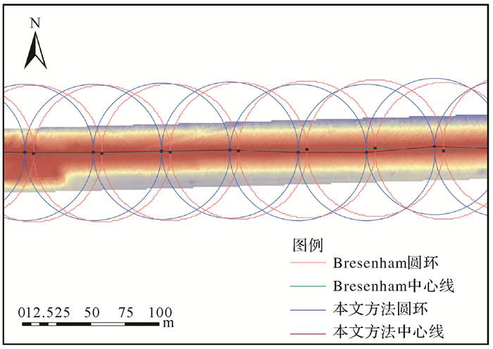 图 23是两种绘圆方法提取堤防中心线的局部结果对比,Bresenham绘圆锯齿状明显。由于两种方法的圆环采样点选取原理不同,使得最大高程点栅格选择会出现一定偏差,导致两种圆环探测结果并不完全重合。本文所采用的圆环绘制方法仅基于圆环中心坐标和半径即可快速计算环上任一点的坐标,且圆环点对称性更好,用于圆环加密探测(图 21)和圆环断面提取(图 10)时简便快捷,比Bresenham绘圆更便于程序实现。