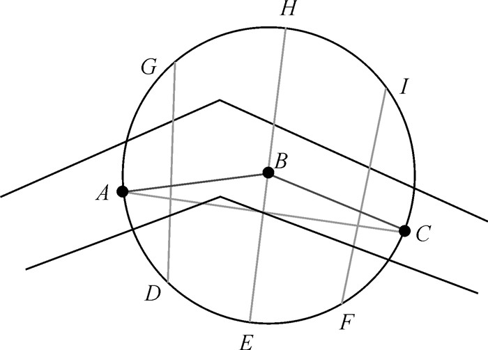 图 20为采用最小成本路径法、矩阵法和圆环探测法得到的堤防中心线结果对比。由于最小成本路径法需要计算路径最短、成本最小(高程最高)的栅格集合,因此在堤防弯曲较大的区域,最小成本路径法得到的堤防中心线出现“抄近路”现象而漏掉堤防中心线关键点。由于圆环探测法中最大高程点探测是在圆环上,一旦堤防“尖点”位于圆环内部,则同样存在漏掉关键点的可能。一种有效的解决方法是对圆环进行加密探测,如图 21所示,A、B、C为堤防中心线点,由于点A和点C位于圆环B的360个环上点次序是可知的,根据对称性,可以计算得出平分线段AC且穿过点B的圆环上点E、H,进而分别计算得出弧AH、HC、AE和EC的二等分点G、I、D、F。可以类似点匹配垂线法,计算线段GD和线段FI穿过堤防区域的最大高程点,分别统计最大高程点与线段AB和BC的垂直距离,通过预先设定的距离阈值确定是否保留该最大高程点作为堤防中心线,从而可以避免漏掉堤防关键点。