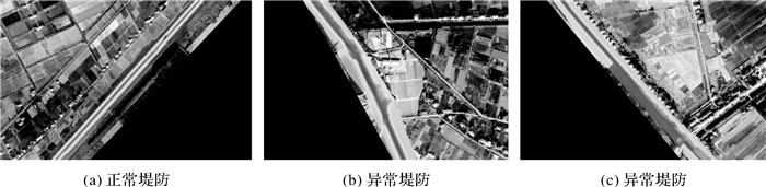 2 特征信息提取方法 2.1 堤防中心线提取 2.1.1 圆环探测法基本原理现有堤防中心线自动提取方法对堤防形态完整性要求较高,然而堤防通常会受到不同程度的破坏,使得堤防形态发生变化,堤防中心线提取难以获得较满意的效果。如图 3所示,以本文研究区为例,堤防受到洪水侵蚀、工程建设等的影响,很难将上述方法用于本文研究区堤防中心线的自动提取。